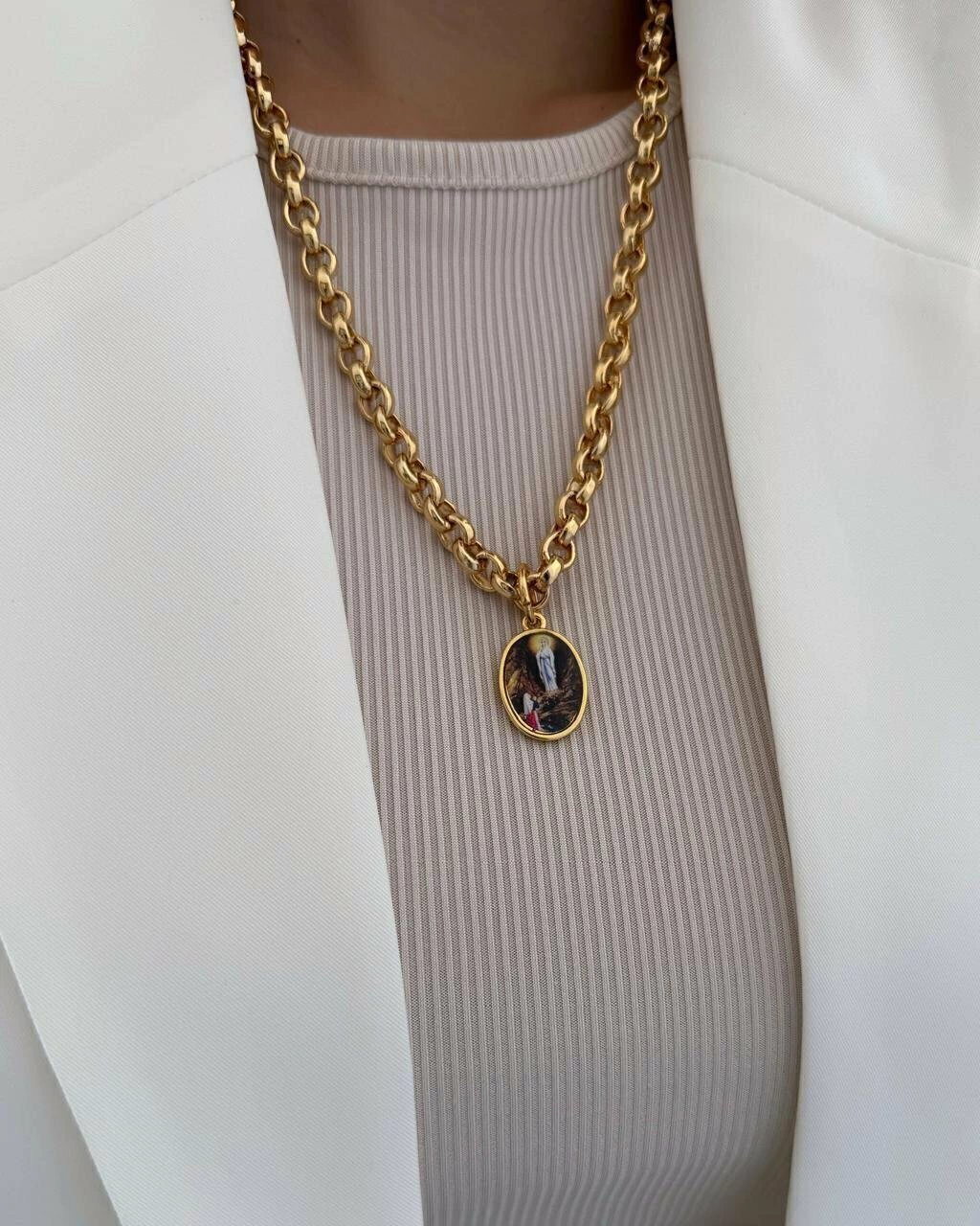 O colar foi criado para mulheres que acreditam que sua devoção pode ser demonstrada além de seu interior. Trazendo elementos que remetem a sua fé e ainda auxiliam internamente em sua autoestima, valorizando seu estilo e sua feminilidade. Adquira agora este lindo colar e tenha em sua coleção um acessório diferenciado e especialmente criado para você.