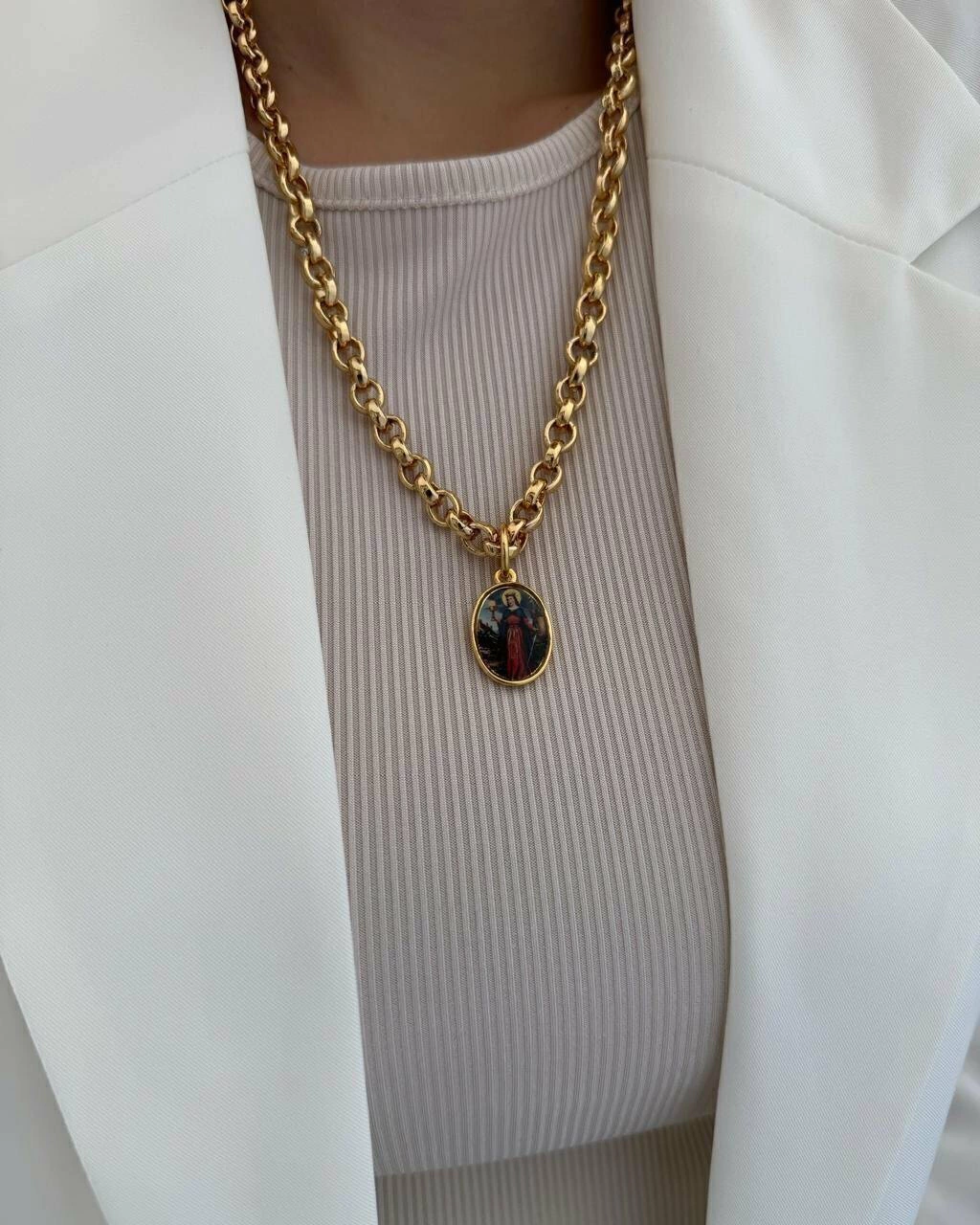 Colar Dourado com Corrente de Elo Português e Pingente de Santa Bárbara
