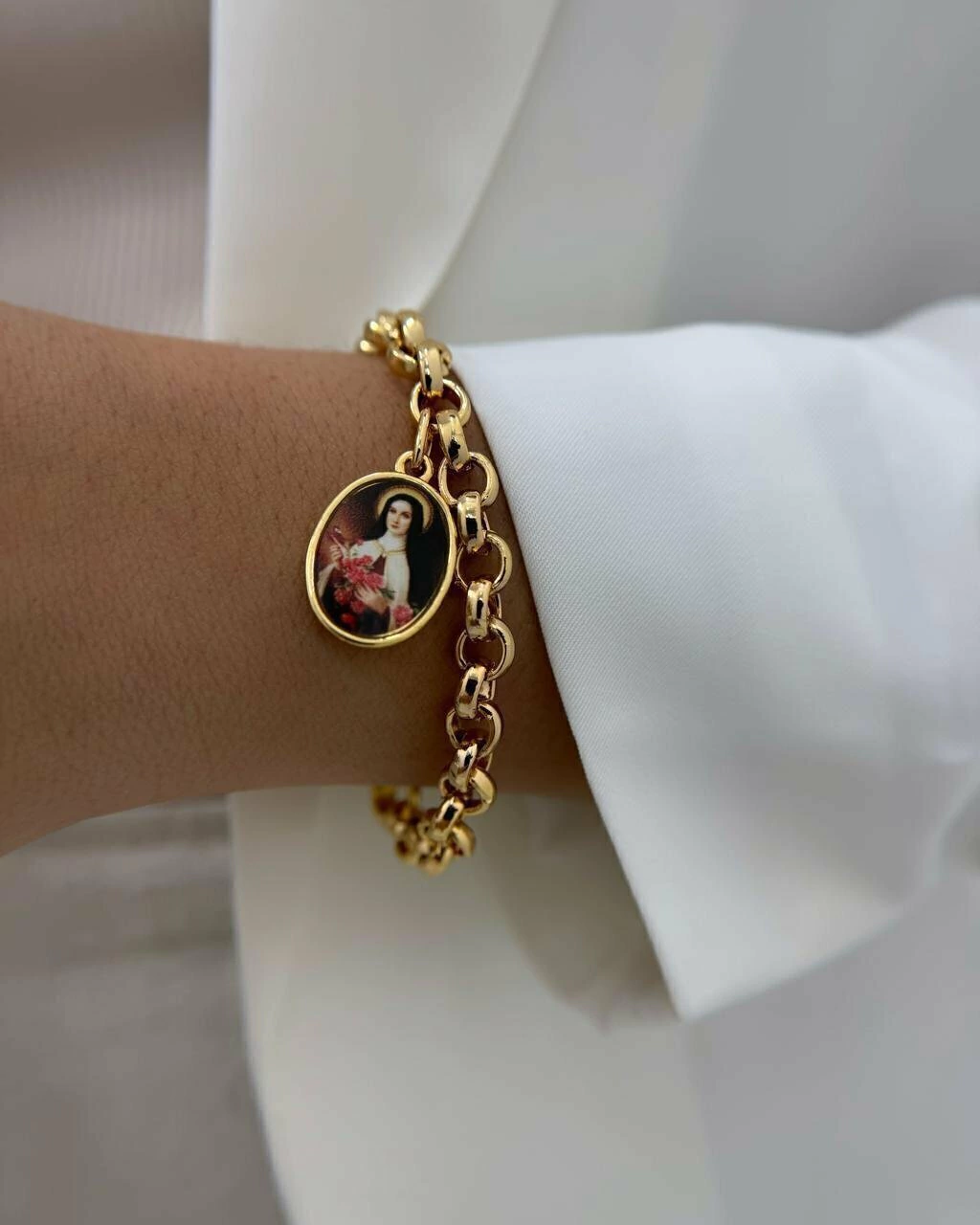 Pulseira Dourada de Elos na Corrente Portuguesa com Pingente de Santa Terezinha do Menino Jesus e da Sagrada Face