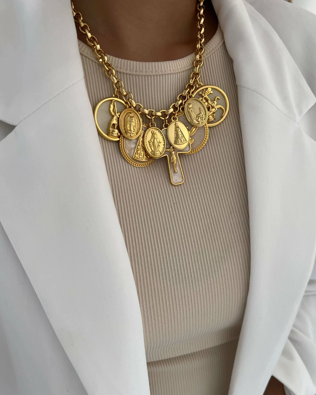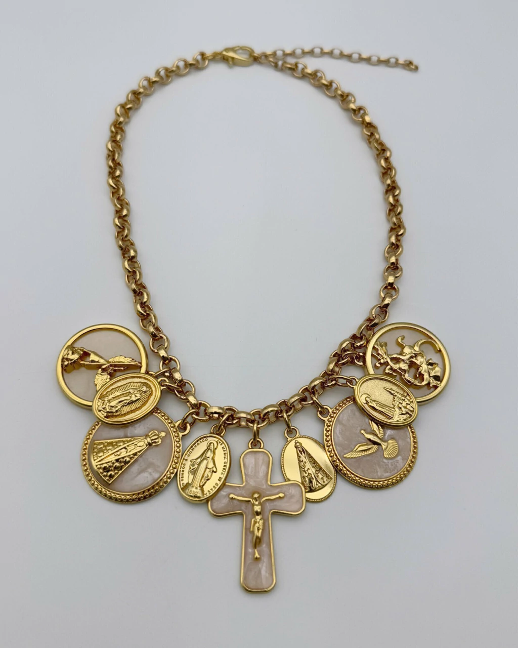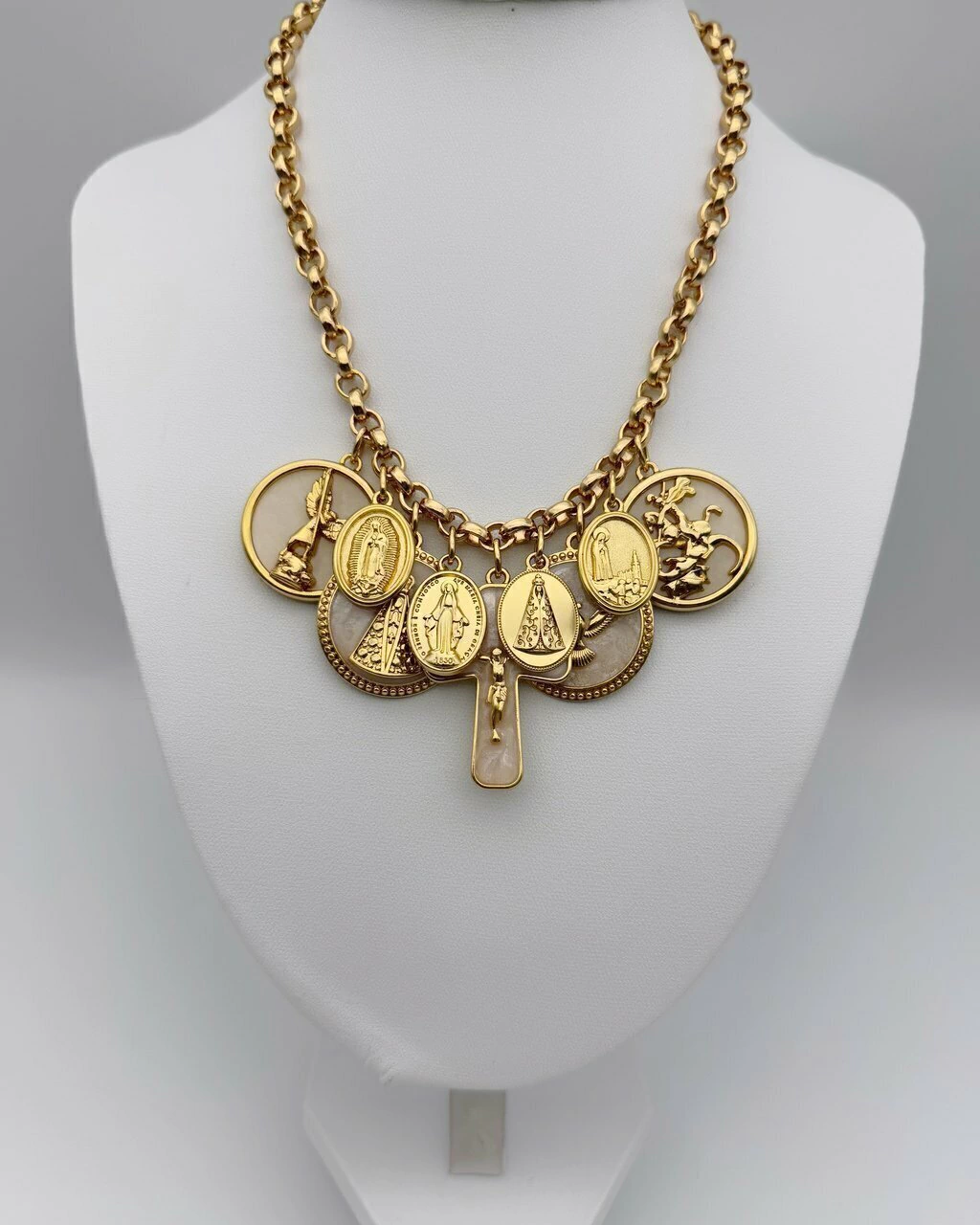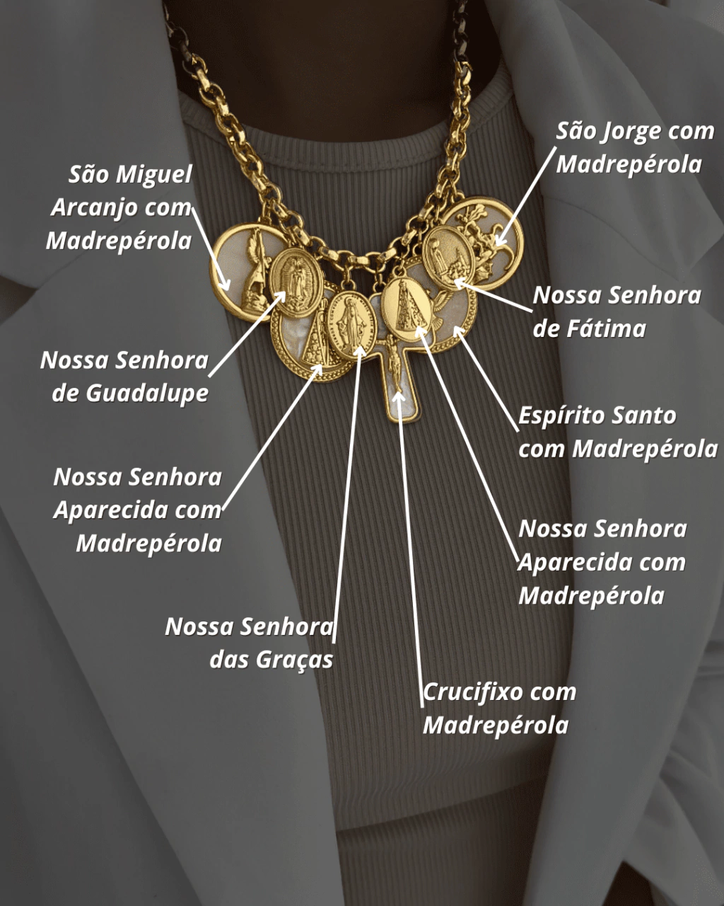 O Colar de Fé foi criado com 9 pingentes, todos eles com seu significado e importância religiosa! Presentes São Miguel Arcanjo, Nossa Senhora de Fátima, Nossa Senhora Aparecida, Nossa Senhora de Guadalupe, Cruz com Jesus Cristo com Madrepérola, Espírito Santo (Pomba da Paz), Medalha Milagrosa (Nossa Senhora das Graças) e São Jorge.