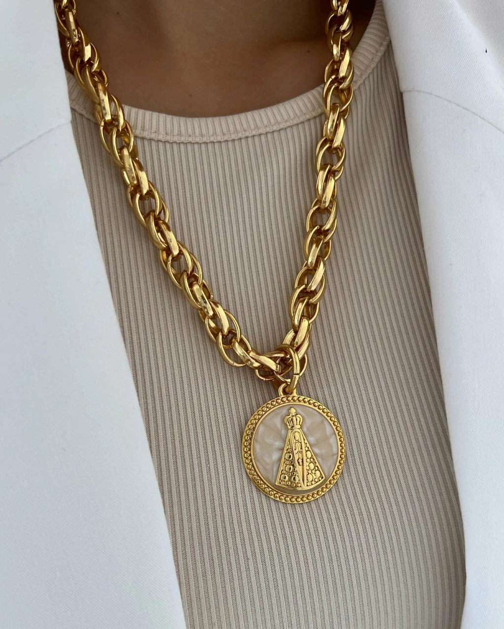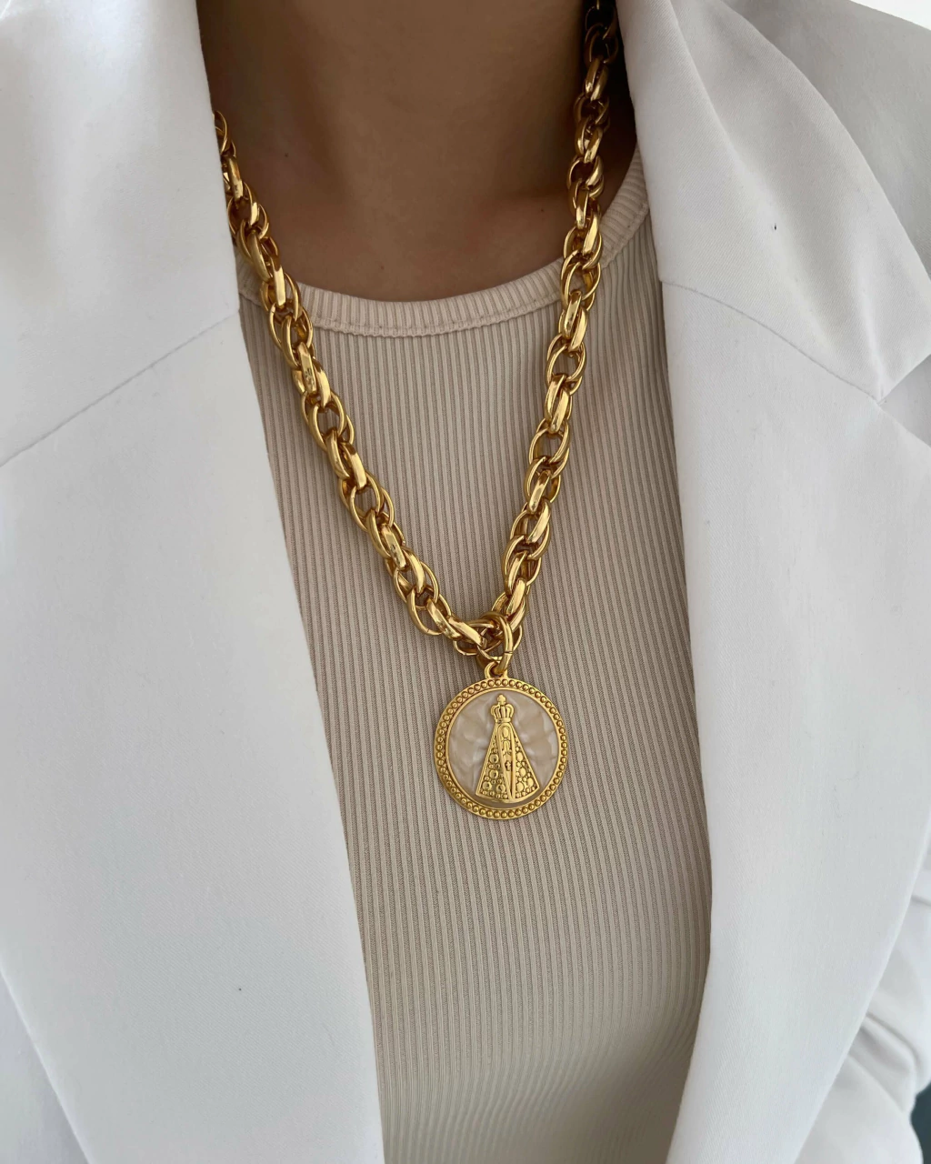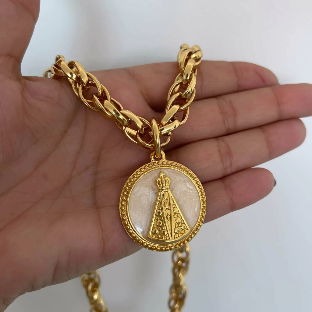 Colar Dourado com Corrente de Baiana e Pingente de Nossa Senhora de Aparecida com Resina Madrepérola