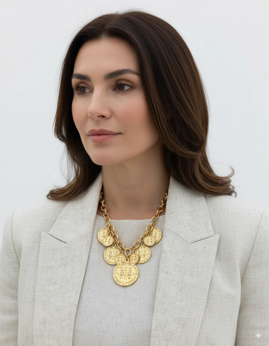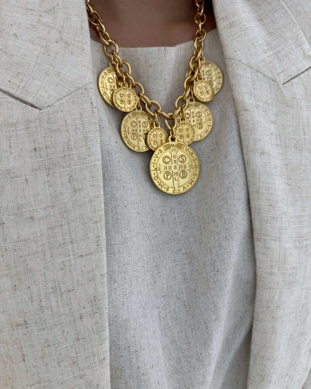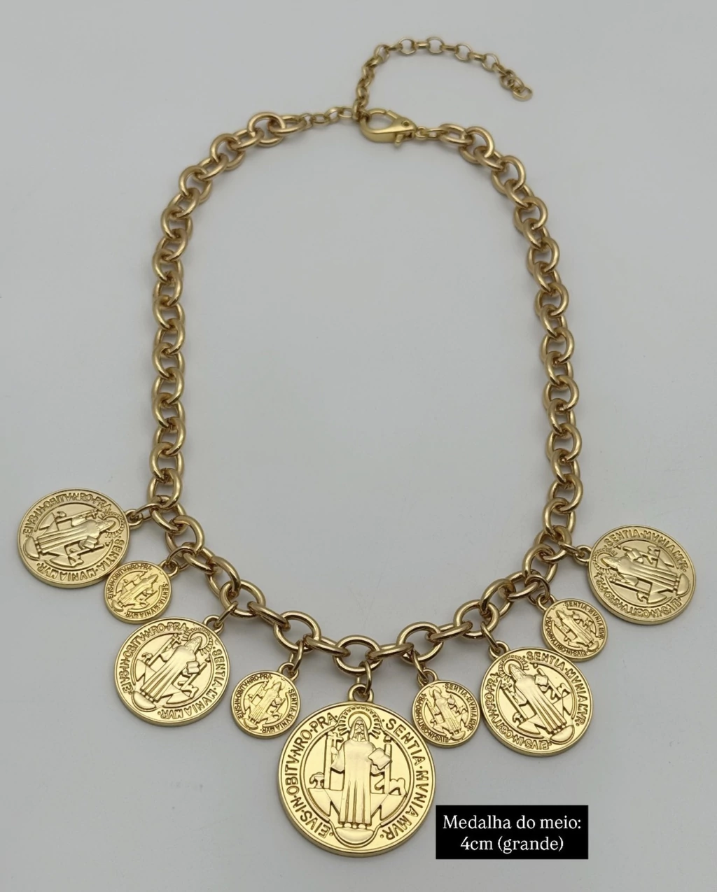O Colar de São Bento é mais do que um acessório, é um símbolo poderoso de fé, proteção e força espiritual. Composto por várias medalhas de São Bento, conhecidas como um verdadeiro escudo contra o mal, este colar protege contra energias negativas, fortalece a confiança em Deus e traz paz ao coração.